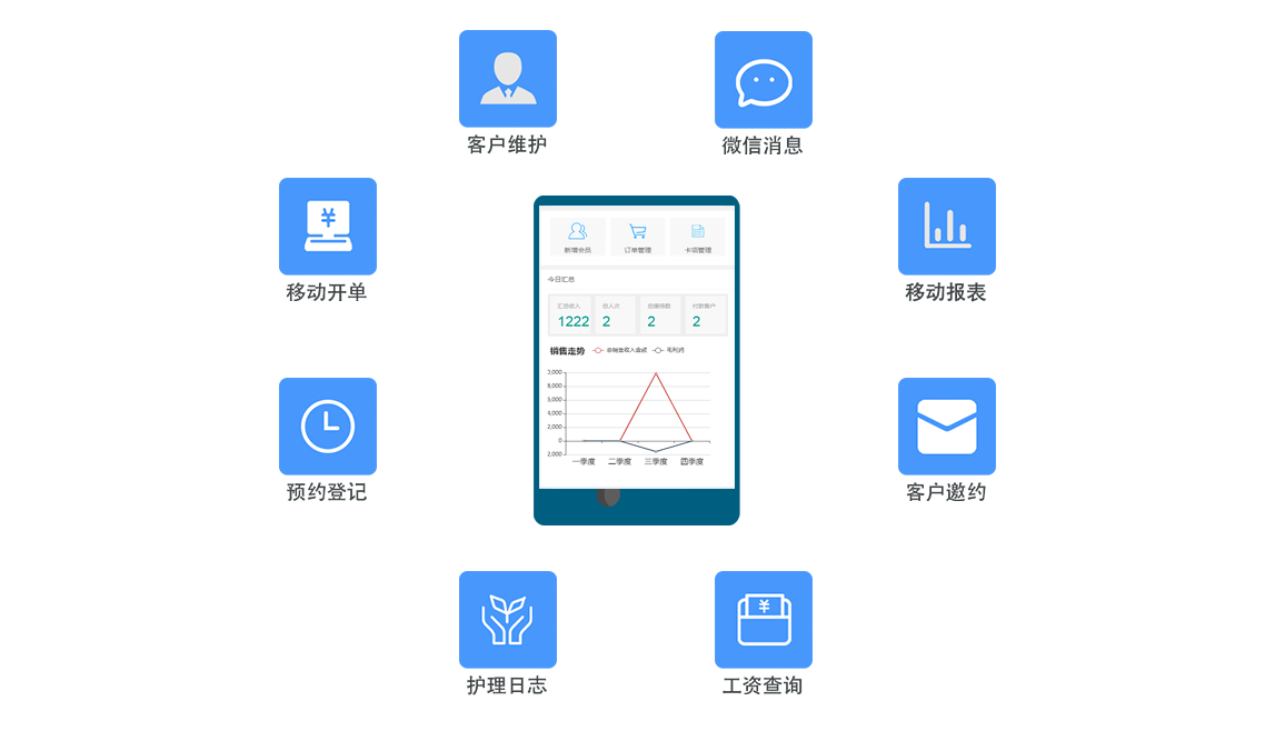 产品进销存、短信营销、移动收款、多级会员、报表统计公众号推送、一键算提成